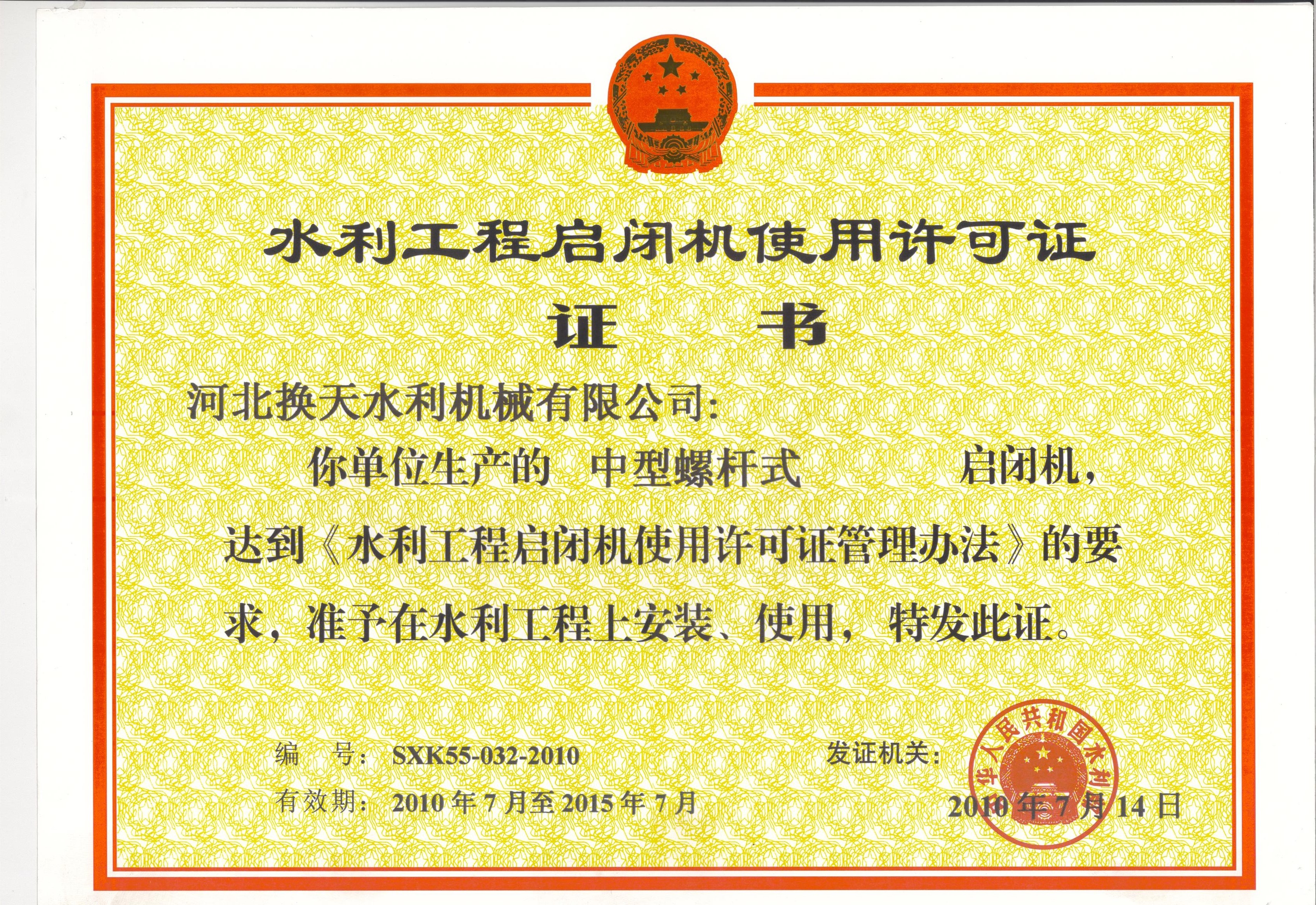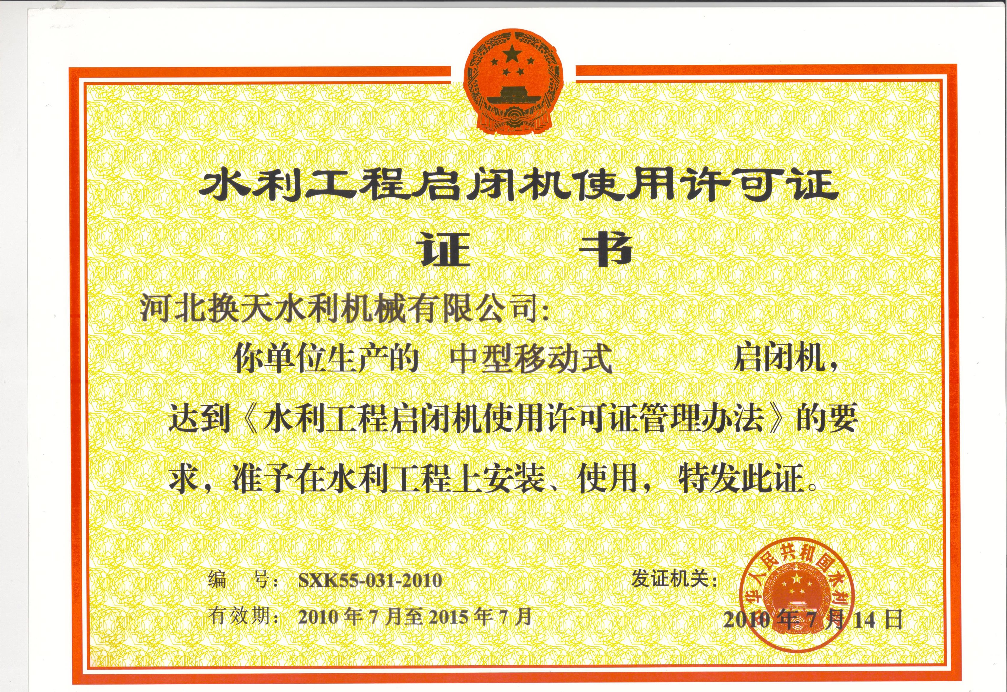 水利工程啟閉機使用許可證